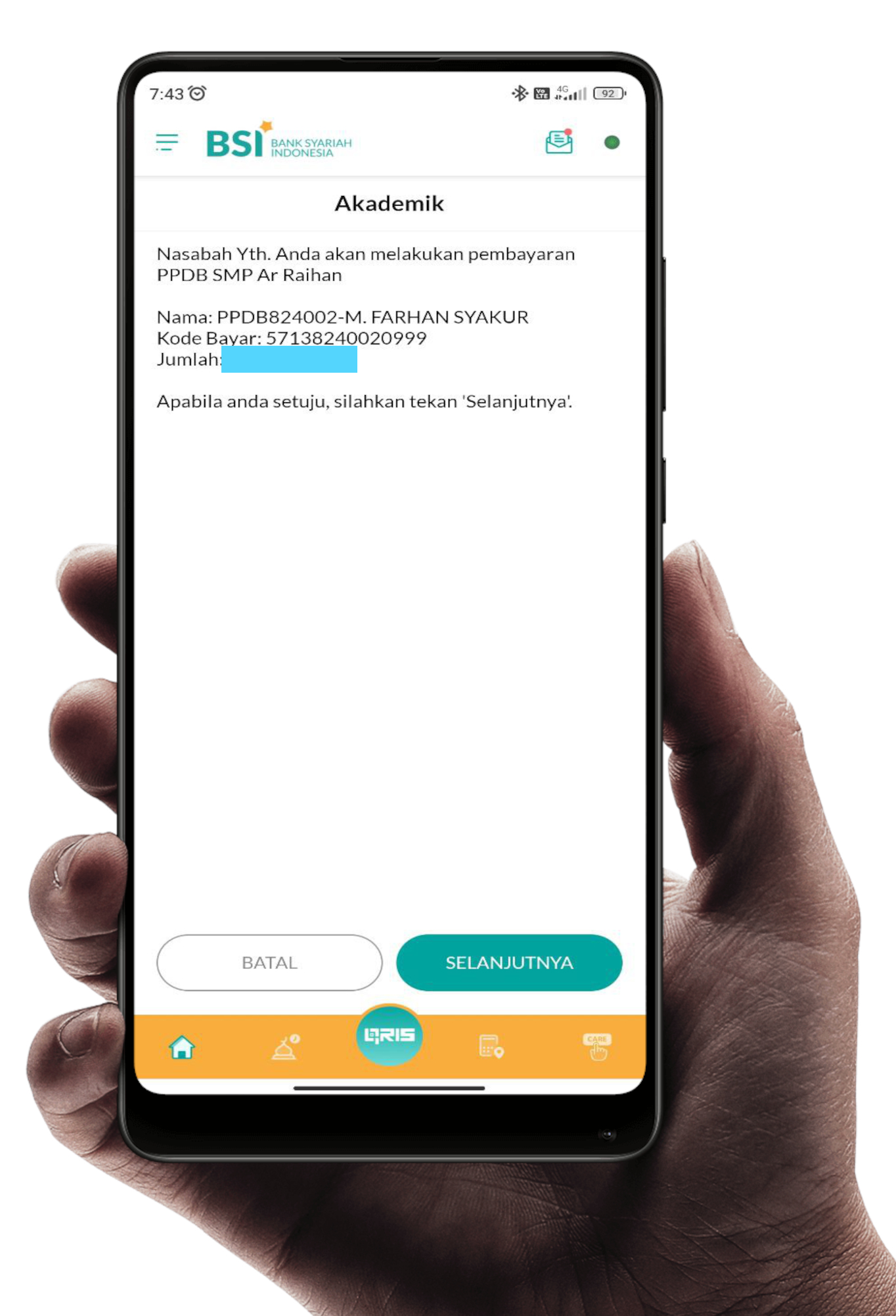 Periksa kembali nama siswa, kode bayar, dan jumlah (nomoinal) yang tertera sebelum mengkonfirmasi pembayaran.